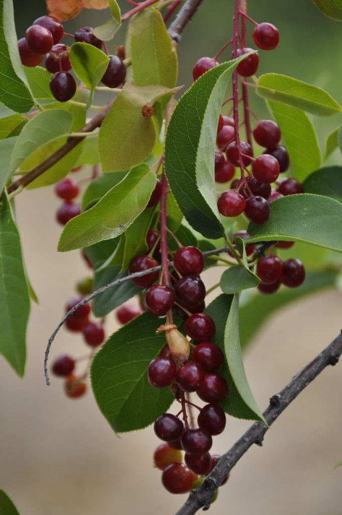 Tall shrub or small tree with many stems and thin, toothed leaves with beautiful dark red fall colours. Clusters of small purple to black cherries develop in late summer.
